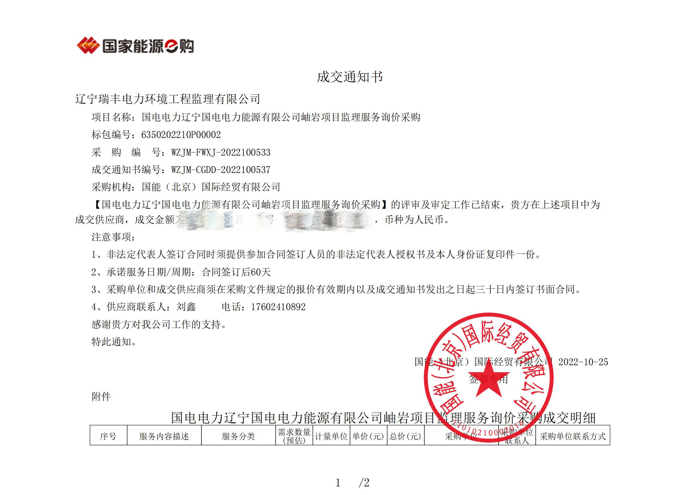 遼寧瑞豐電力環(huán)境工程監(jiān)理有限公司于2022年10月20日與鞍山國電電力新能源有限公司簽訂了《國電電力遼寧岫巖整縣光伏發(fā)電一期農(nóng)光、漁光互補項目》監(jiān)理合同。