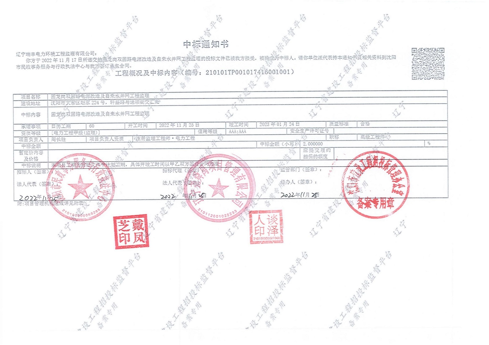 中標喜訊-回龍崗雙回路電源改造及自來水并網(wǎng)工程監(jiān)理